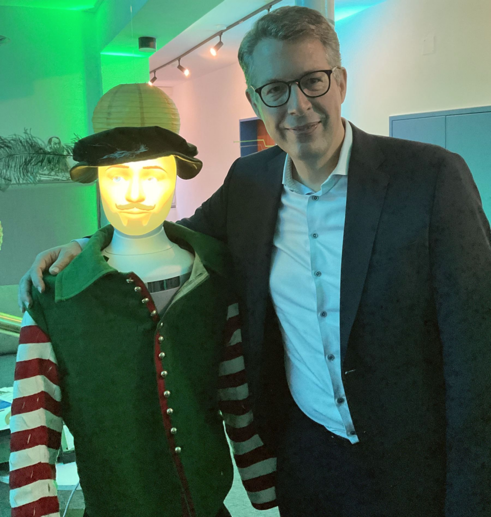 Eine Zeitreise zum markgräflichen Hofastronomen Simon Marius bietet die generative MariusKI bei der Langen Nacht der Wissenschaften Nürnberg-Fürth-Erlangen am Samstag, 25. Oktober 2025. Im frühen 17. Jahrhundert war der Weltsystemstreit noch nicht entschieden, aber neue teleskopische Beobachtungen lieferten spannende Argumente. Mitten im Geschehen war Simon Marius. Gemeinsam mit der Hochschule Ansbach demonstriert die Simon Marius Gesellschaft im Foyer vom Nicolaus-Copernicus-Planetarium den Roboterkopf mit der MariusKI (im Foto mit Wissenschaftsminister Markus Blume). Besucher können die KI zu Marius und der Astronomie seiner Zeit befragen.